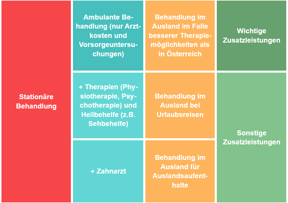 Die verschiedenen privaten Krankenversicherungen sind wie Basisabsicherungen. Diese Basisabsicherungen können Sie durch verschiedene Zusatzbausteine  erweitern und an Ihre Bedürfnisse anpassen. Das beeinflusst in weiterer Folge natürlich die Kosten  Ihrer privaten Krankenversicherung.