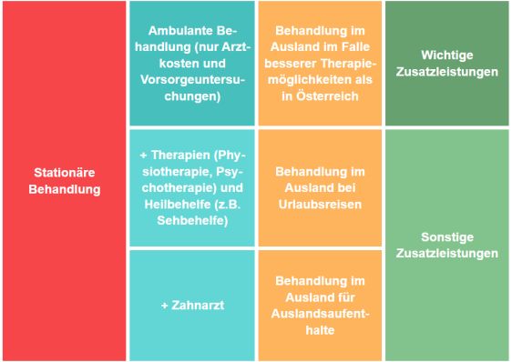Die Leistungen der Krankenversicherung umfassen Krankenbehandlungen, also ärztliche Hilfe, Heilmittel und Heilbehelfe, und Geldleistungen wie Krankengeld und Wochengeld. Was genau mitversichert ist hängt vom jeweiligen Versicherungsvertrag ab.